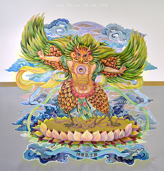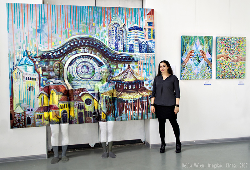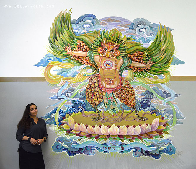 The canvas painting was created in Vienna, Austria. The artwork was printed as a large canvas in China. I bodypainted two models for the opening of the exhibition.